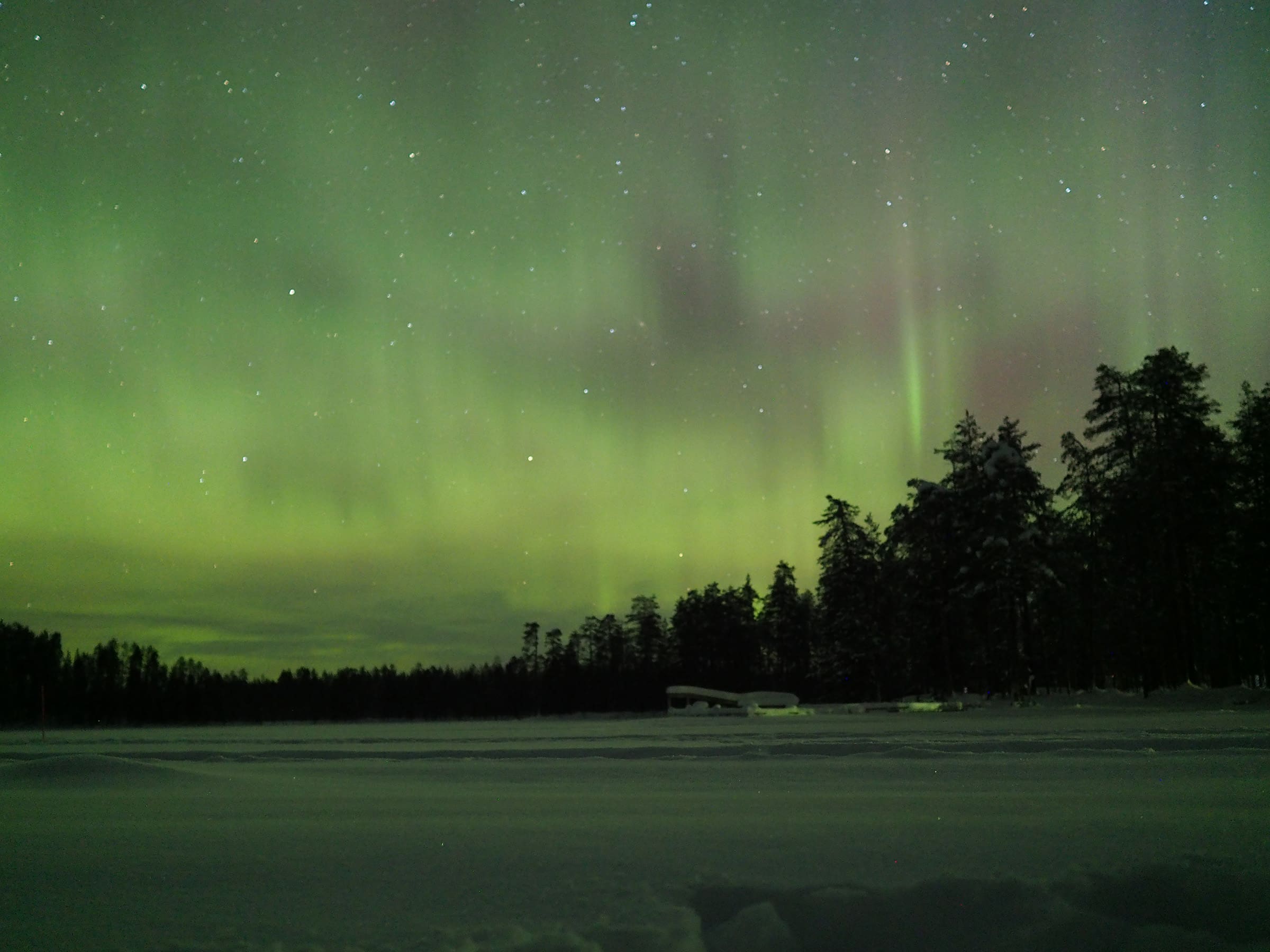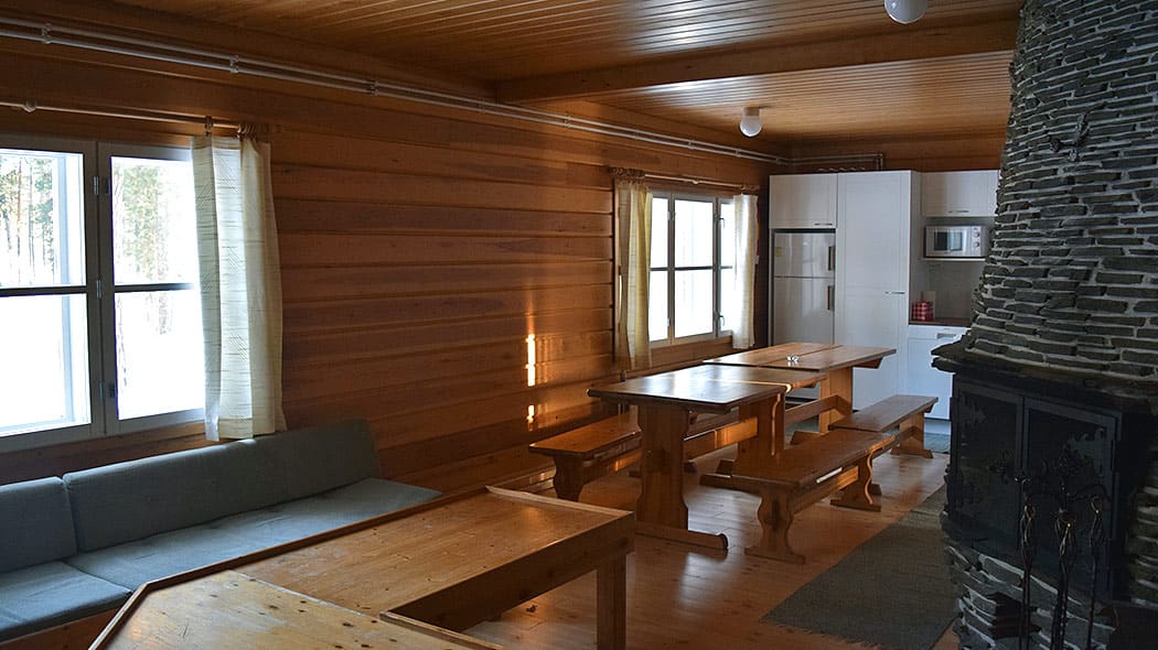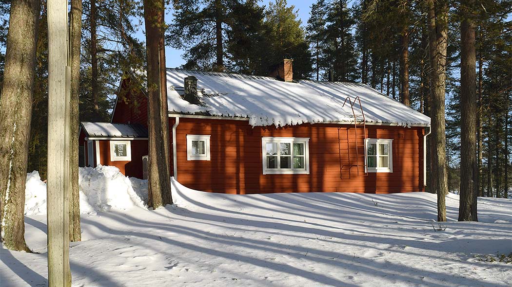 We verblijven in Jatkonsalmi, een traditionele houthakkershut langs het meer.